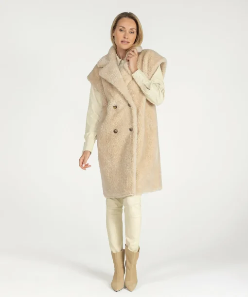 Maak Kennis Met De Chella Gilet, Een Luxueuze Toevoeging Aan Je Wintergarderobe. Dit Maxi Gilet Is Gemaakt Van Zacht Teddybont In De Prachtige Creamy White Kleur. Wat De Chella Echt Bijzonder Maakt, Is Dat Deze Reversible Te Dragen Is. Je Kunt Dus Genieten Van Twee Verschillende Looks In Één Item. De Overslag Aan De Voorkant Sluit Met Knopen, Waardoor Het Gilet Een Elegante Uitstraling Krijgt. Of Je Nu Casual Gekleed Gaat Of Een Stijlvolle Look Wilt Creëren, Het Chella Gilet Biedt Zowel Stijl Als Comfort.