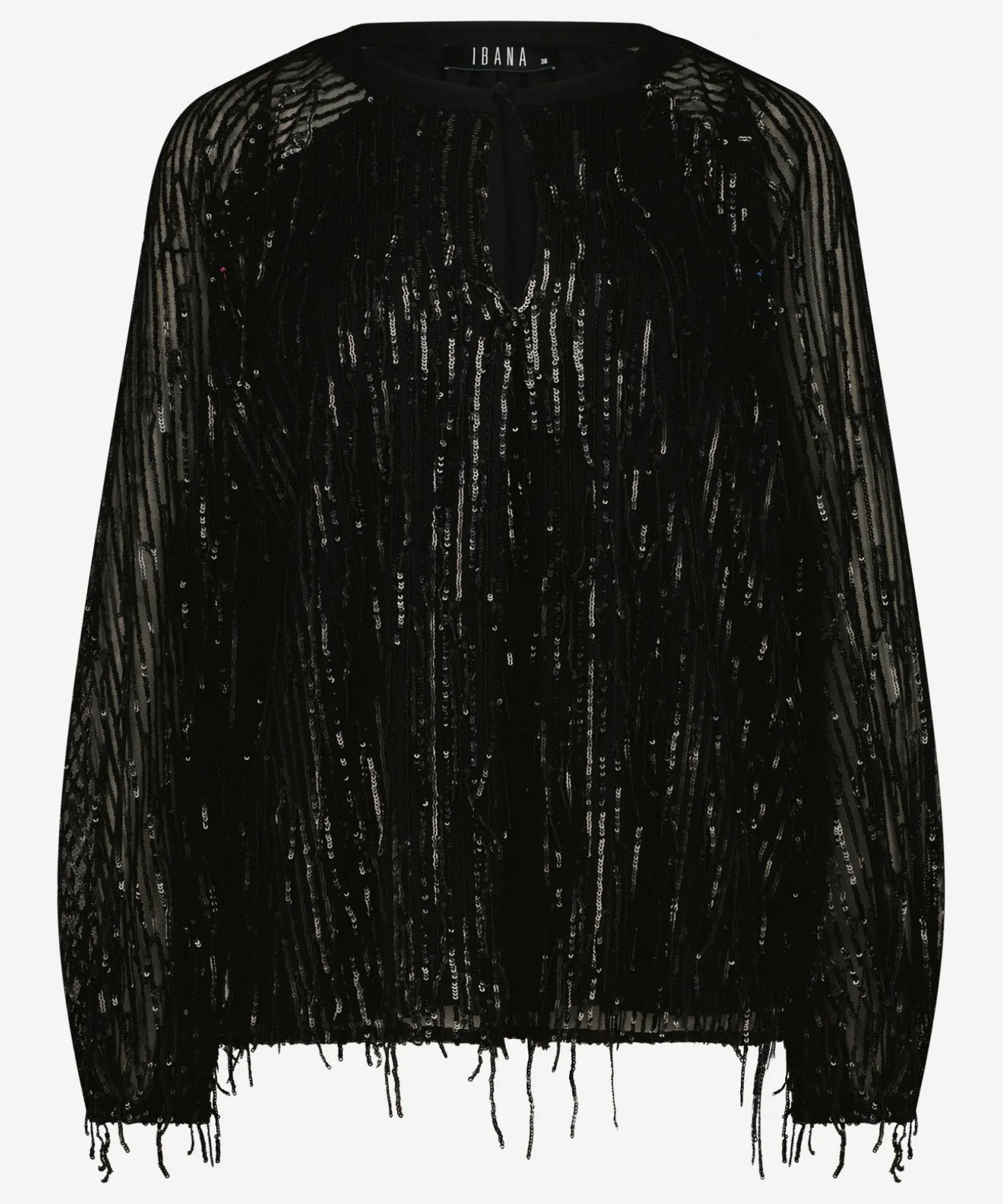 Maak Kennis Met De Folette Fringes Blouse In De Kleur Black. Deze Paillettenblouse Is Een Ware Blikvanger. De Blouse Omvat Een Elegante Ronde Hals Met Een Subtiele, Vrouwelijke Touch Dankzij Een Kleine, Ronde Opening. Dit Model Heeft Een Losvallende Pasvorm En De Licht Doorschijnende, Lange Mouwen Geven Net Wat Extra’s. Deze Blouse Is Perfect Met Een Pantalon Of Een Rok Voor Een Chique Look, Terwijl Het Ook Met Een Jeans Een Meer Ontspannen, Casual Look Creëert.