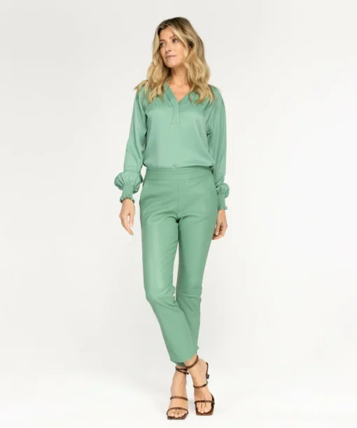 Is Een Perfecte Leren Broek Met Een Mooie Pasvorm. Deze Broek Heeft Een Stretch Basis En Een Buitenlaag Van Hoogwaardig En Soepel Leer. Door De Stretch Basis Zit Deze Broek Als Gegoten En Kun Je Je Er Lekker In Bewegen. Ook De Band Sluit Mooi Aan Doordat Er Ook Stretch In Is Verwerkt. Aan De Achterkant Bevinden Zich Twee Blinde Steekzakken. De Broek Loopt Naar Beneden Iets Smaller Toe Waardoor Deze Prachtig Staat Met Een Elegante Hak Zoals Het Adel Muiltje. De Pablo Broek Is Ook Beschikbaar In De Kleuren Buttery Yellow, Crystal Blue En Almond White.