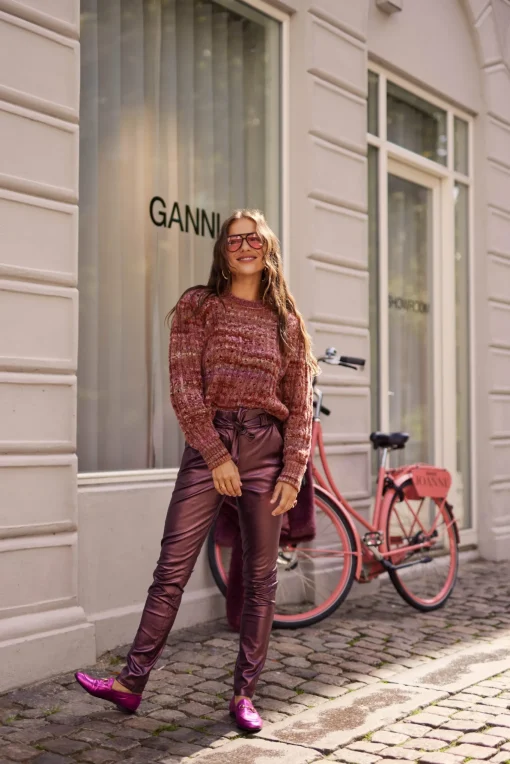 Ontdek De Stijlvolle Paulina Metallic Broek In De Prachtige Kleur Dusty Rose Gemaakt Van Een Prachtige Leer Stretch Kwaliteit. Deze Broek Heeft Een Flatterende, Aansluitende Pasvorm Die Je Figuur Mooi Laat Uitkomen. Met De Ritssluiting Aan De Voorkant Is Deze Broek Niet Alleen Trendy, Maar Ook Gemakkelijk Aan Te Trekken. De Twee Paspelzakken Op De Achterkant Voegen Een Vleugje Elegantie Toe. Het Bijpassende Ceintuur, Gemaakt Van Hetzelfde Leer Als De Broek, Kan Gestrikt Worden Voor Een Speels Detail. Of Je Nu Een Casual Of Een Meer Formele Look Wilt, De Paulina Broek Is Een Veelzijdige Keuze Die Comfort En Stijl Combineert Voor Elke Gelegenheid.