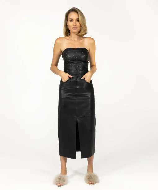 Ready To Be Iconic? Maak Kennis Met De Iconische Bustiertop Taar In Black Maar Dit Keer Met Prachtige Zilverkleurige Studs. Deze Strapless Stijl Heeft Een Nauwsluitend Silhouet Met Stikseldetails Voor Een Korsetachtig Effect. De Taar Is Gemaakt Van Het Zachtste Leer Voor Ultiem Comfort. De Top Wordt Gesloten Middels Een Ritssluiting Aan De Achterkant. Stylingtip: Draag De Top Met De Bijpassende Perfecta Pantalon Welke Ook Aan Studs De Voorijzijde Van De Broekspijpen Heeft. Liever Een Klassieke?Voeg Jouw Favoriete Pumps Toe En Je Bent Klaar Voor De Dag! De Taar Top Is Ook Beschikbaar In Taar Silver En Taar Metallic Lilac.