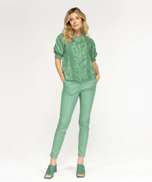 Het Bloesje Heeft Broderie Details En Hippe Pofmouwtjes. De Takota Heeft Knoopjes Tot Bovenaan En Een Ronde, Iets Opstaande Hals. De Blouse Is Gemaakt Van Luchtig Katoen Dus Zeer Geschikt Voor De Warme Zomerdagen. Deze Vrouwelijke Stijl Is Prachtig Te Combineren Met Stoere Items Zoals Laarsjes, Een Riem Of Een Mooie Leren Tas. De Takota Blouse In Jade Green Is In Dezelfde Stof Uitgevoerd Als Het Rokje Selma Uit Ibana’s Collectie En Kan Bij Elkaar Gedragen Worden Als Co-Ord. De Takota Blouse Is Ook Beschikbaar In Buttery Yellow.