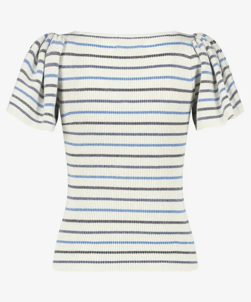 De Thaira Top In Gestreepte Airy Blue Is Een Echte Musthave! De Lurex Geribde Stof Maakt De Top Alles Behalve Basic. De Top Heeft Een V-Hals En Een Aansluitende Pasvorm. De Korte Mouwen Bevatten Aan De Schouders Plooien Wat De Top Een Speels Effect Geeft. De Top Is Ideaal Te Combineren Met Een Jeans Of Een Passende Pantalon. De Thaira Top Is Ook Beschikbaar In De Kleuren Blush, Light Pink En Snake Green.