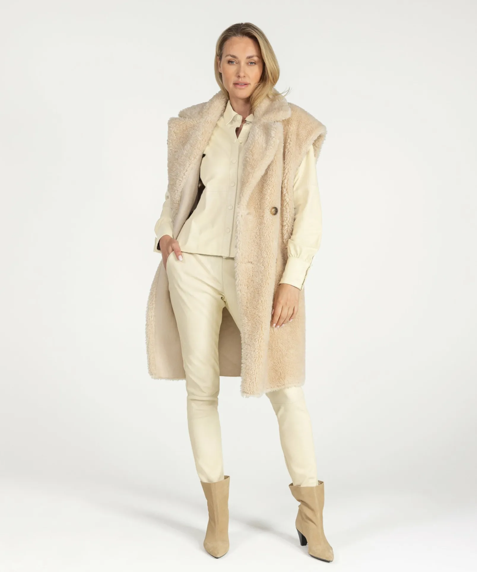 Maak Kennis Met De Chella Gilet, Een Luxueuze Toevoeging Aan Je Wintergarderobe. Dit Maxi Gilet Is Gemaakt Van Zacht Teddybont In De Prachtige Creamy White Kleur. Wat De Chella Echt Bijzonder Maakt, Is Dat Deze Reversible Te Dragen Is. Je Kunt Dus Genieten Van Twee Verschillende Looks In Één Item. De Overslag Aan De Voorkant Sluit Met Knopen, Waardoor Het Gilet Een Elegante Uitstraling Krijgt. Of Je Nu Casual Gekleed Gaat Of Een Stijlvolle Look Wilt Creëren, Het Chella Gilet Biedt Zowel Stijl Als Comfort.