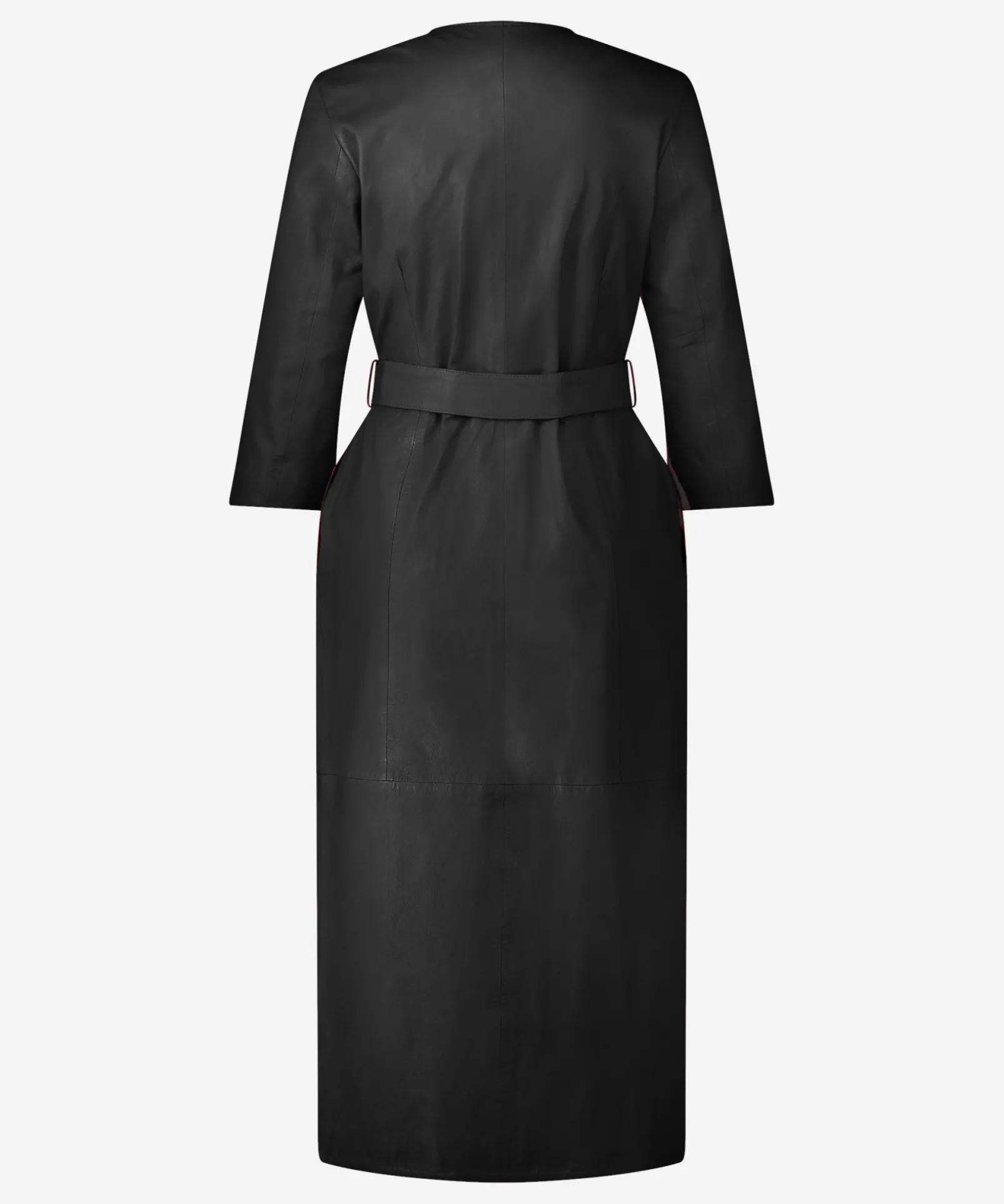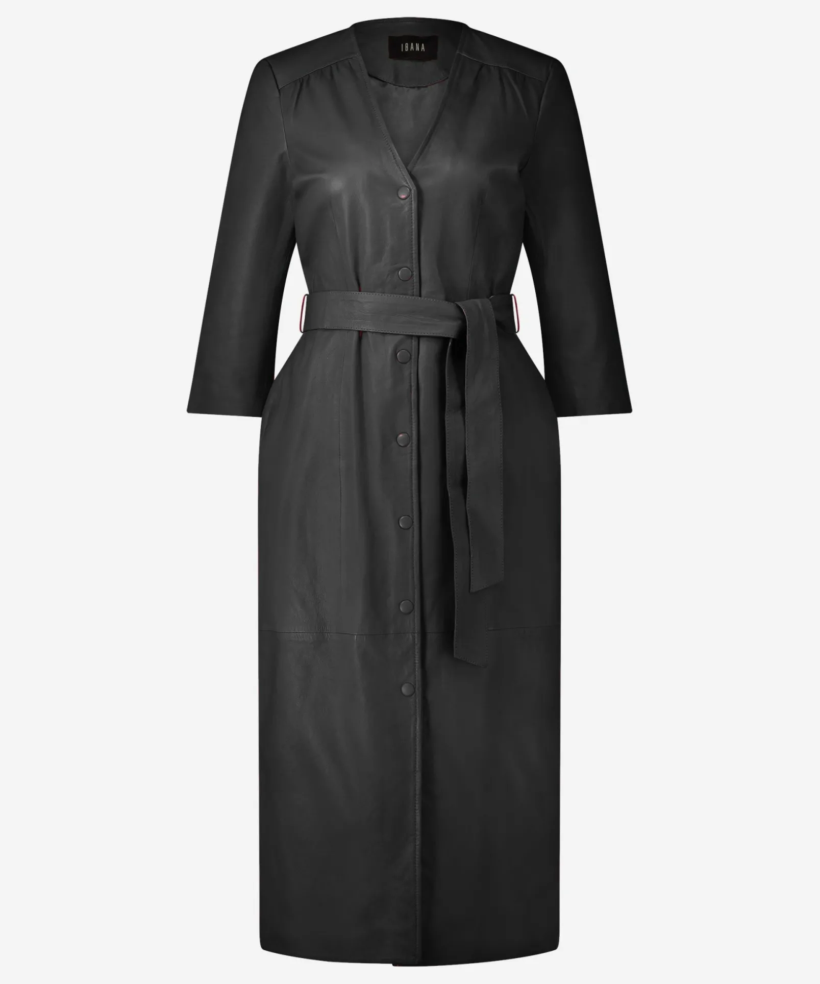De Dalou Jurk Is Een Tijdloos En Verfijnd Kledingstuk, Gemaakt Van Zwart Leer. Met Zijn Knoopsluiting Aan De Voorkant, Driekwart Mouwen En Lengte Tot Over De Knieën, Straalt Deze Jurk Zowel Elegantie Als Moderniteit Uit. Het Luxueuze Zwarte Leer Geeft Een Gevoel Van Zelfvertrouwen, Terwijl Het Strakke Silhouet Het Lichaam Op Een Elegante Manier Accentueert. De Jurk Is Veelzijdig En Kan Zowel Casual Als Formeel Gedragen Worden, Waardoor Het Een Waardevolle Aanvulling Is Op Elke Garderobe.