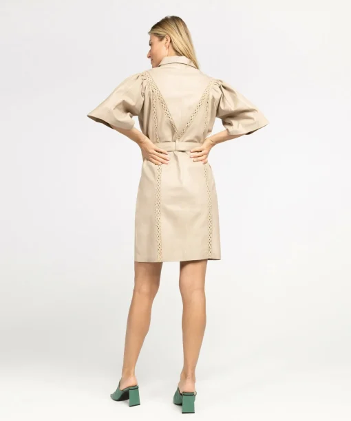 Een Zeer Stijlvolle Jurk Gemaakt Van Bijzonder Soepel Leer Waar Je Een Onvergetelijke Indruk Mee Maakt. De Details Van De Jurk Zijn Opvallend En Maken Deze Jurk Bijzonder. In Geperforeerd Leer Zijn Er V-Vormige Banen Aangebracht Aan De Voor- En Achterkant Die Inblenden Met Het Model Van De Jurk. De Jurk Wordt In De Taille Gestrikt Met Een Leren Ceintuur In Dezelfde Kleur Als De Jurk, En Is Voorzien Van Drukknopen. Deze Jurk Is Perfect Te Combineren Met Mooie Sandalen Met Hakken Zoals De Adel In Jade Green Of Almond White Of Juist Met Laarsjes Voor Een Stoerdere Look. De Doris Jurk Is Ook Beschikbaar In De Kleur Crystal Blue.