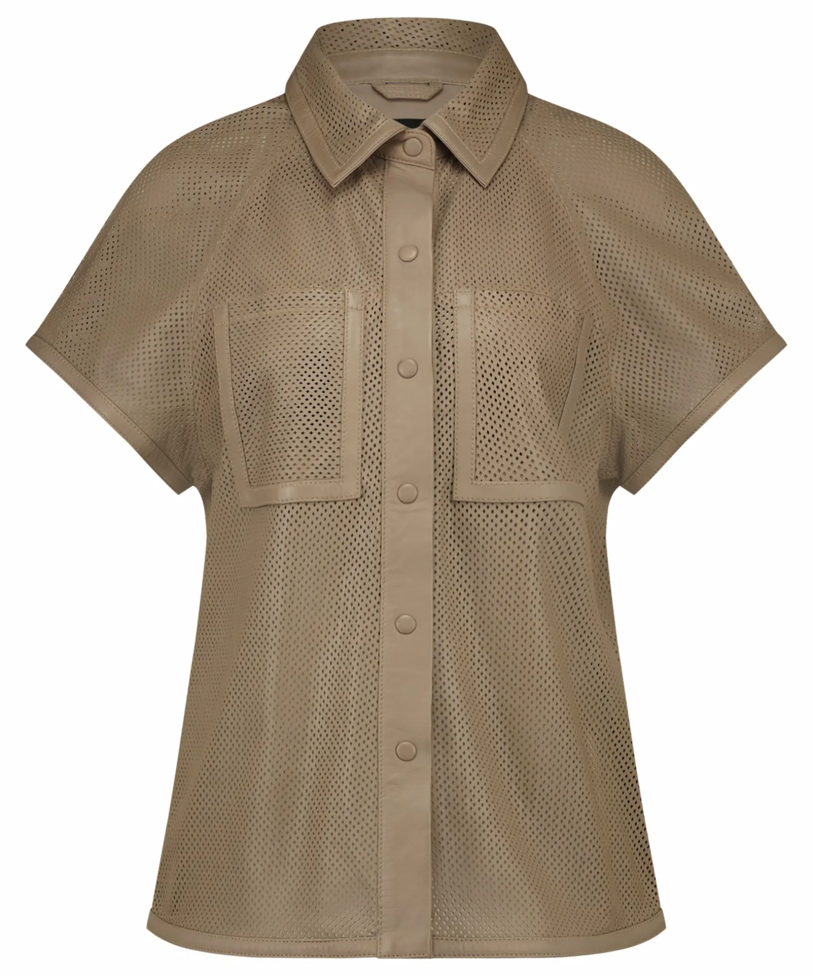 Maak Kennis Met De Tova Blouse. Een Prachtige Geperforeerde Leren Blouse Met Drukknopen. De Tova Heeft Een Iets Ruimere Fit Rondom De Mouwen.